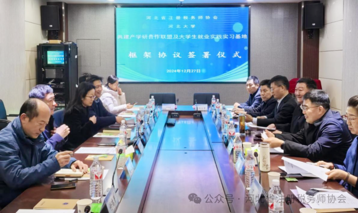 2024年12月27日,河北省注册税务师协会与河北大学产学研合作单位签约仪式、首批税务师事务所与河北大学实习实践基地签约仪式在河北大学举行。此次活动旨在深入贯彻落实产教融合的工作要求,推动税收专业教育与产业实践深度融合,共同培养具备专业素养和创新能力的税务师行业高素质人才,实现高校教育与税务师行业共赢发展。河北大学校党委副书记徐建民、河北省注册税务师协会会长郑炳玉、副会长陈洁、国家税务总局保定市税务局局长李剑峰出席仪式。河北大学教务处、管理学院领导班子、首批7家税务师事务所负责人参加活动,管理学院院长杨文杰主持签约仪式。